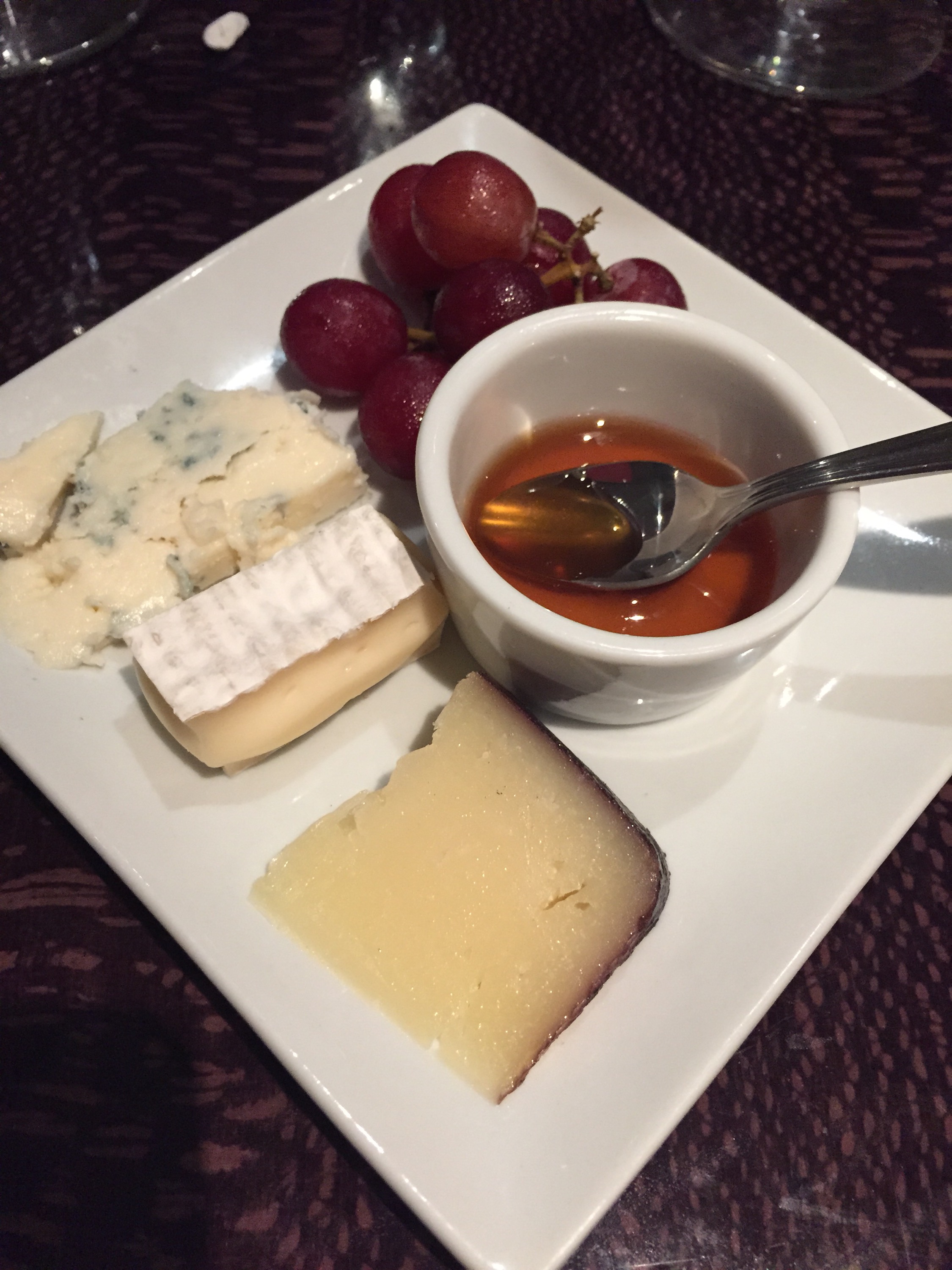 Our second to last course was a Cheese Course made up of seedless grapes, Maytag Blue Cheese (cow cheese) from Iowa (far left), Melinda May from Mystic Cheese Company in Mystic, Connecticut (made from cow milk in the summer and goat cheese in the winter), a fifteen year Pecorino Brio de Vino from Italy (right; this sheep cheese is aged in terra cotta vases with wine), and honey from Red Bee Apiary in Wilton, Connecticut.