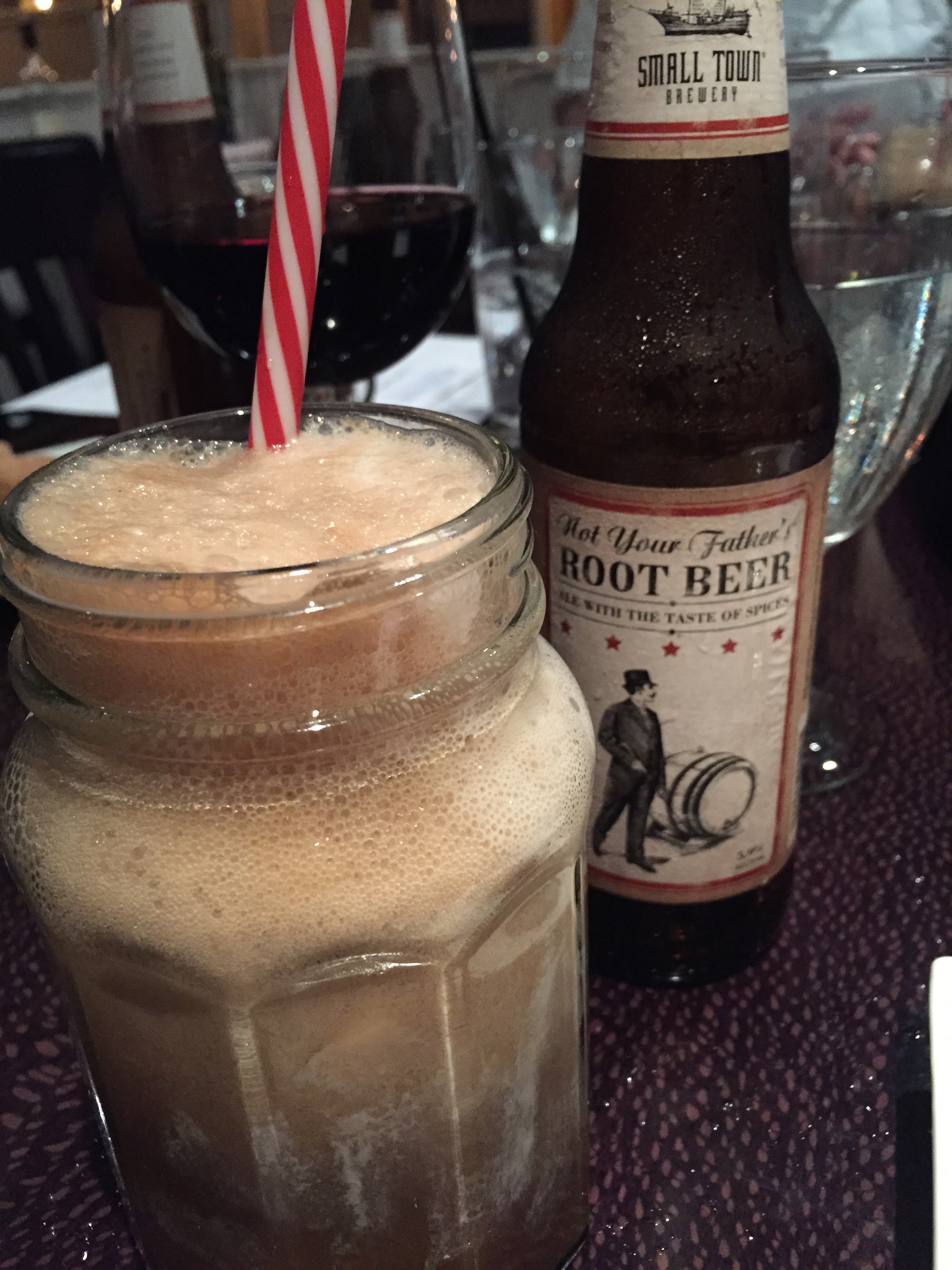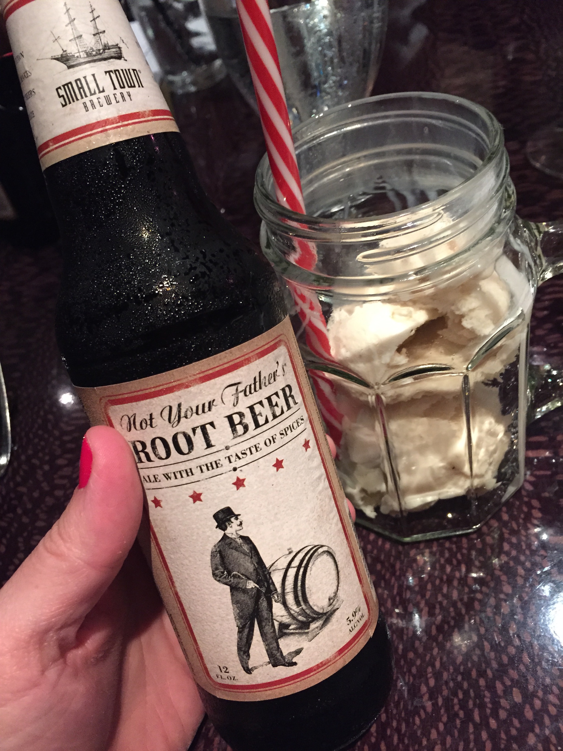 Small Town Brewery makes this sinfully delicious beer that tastes just like root beer soda called Not Your Father’s Root Beer. It’s only recently become available in Connecticut and I was able to try it recently, however this is the first time I have tried it as a float! If you didn’t know it was Not Your Father’s Rootbeer you might easily mistake it for a Rootbeer soda. This special treat was thought up by General Manager Mark Turocy and I am so grateful he did! This wasn’t just vanilla ice cream in our floats, this was Vanilla Bourbon Gelato with 5.9% Not Your Father’s Root Beer poured over the top and the striped straws made it even more fun!