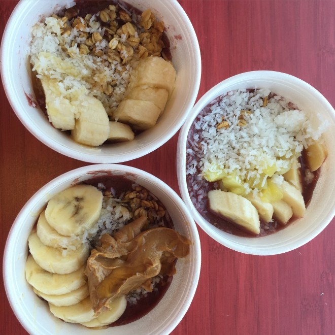 Aloha Bowl (right) is blended with acai purée and fresh watermelon and topped with granola, fresh bananas, blueberries, pineapples, shredded coconut, and a drizzle of raw honey.